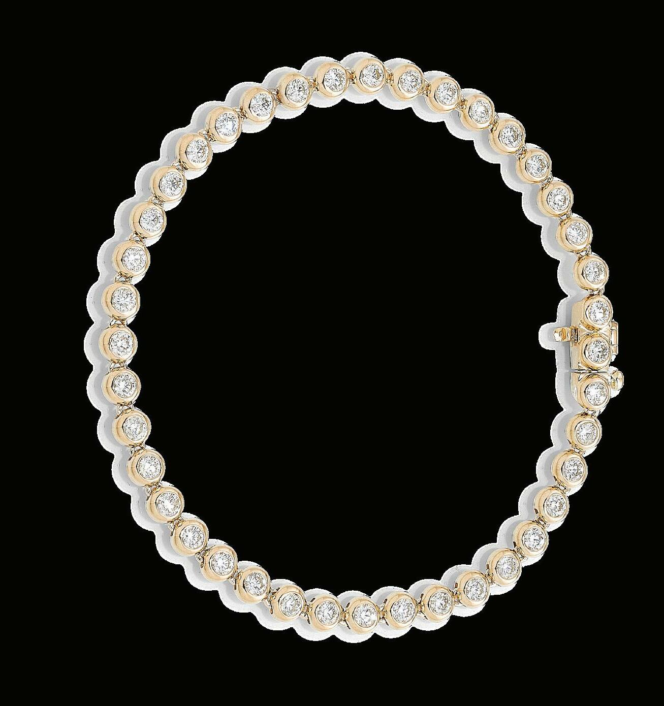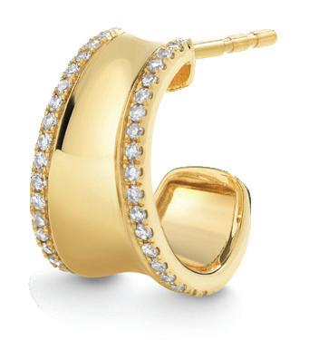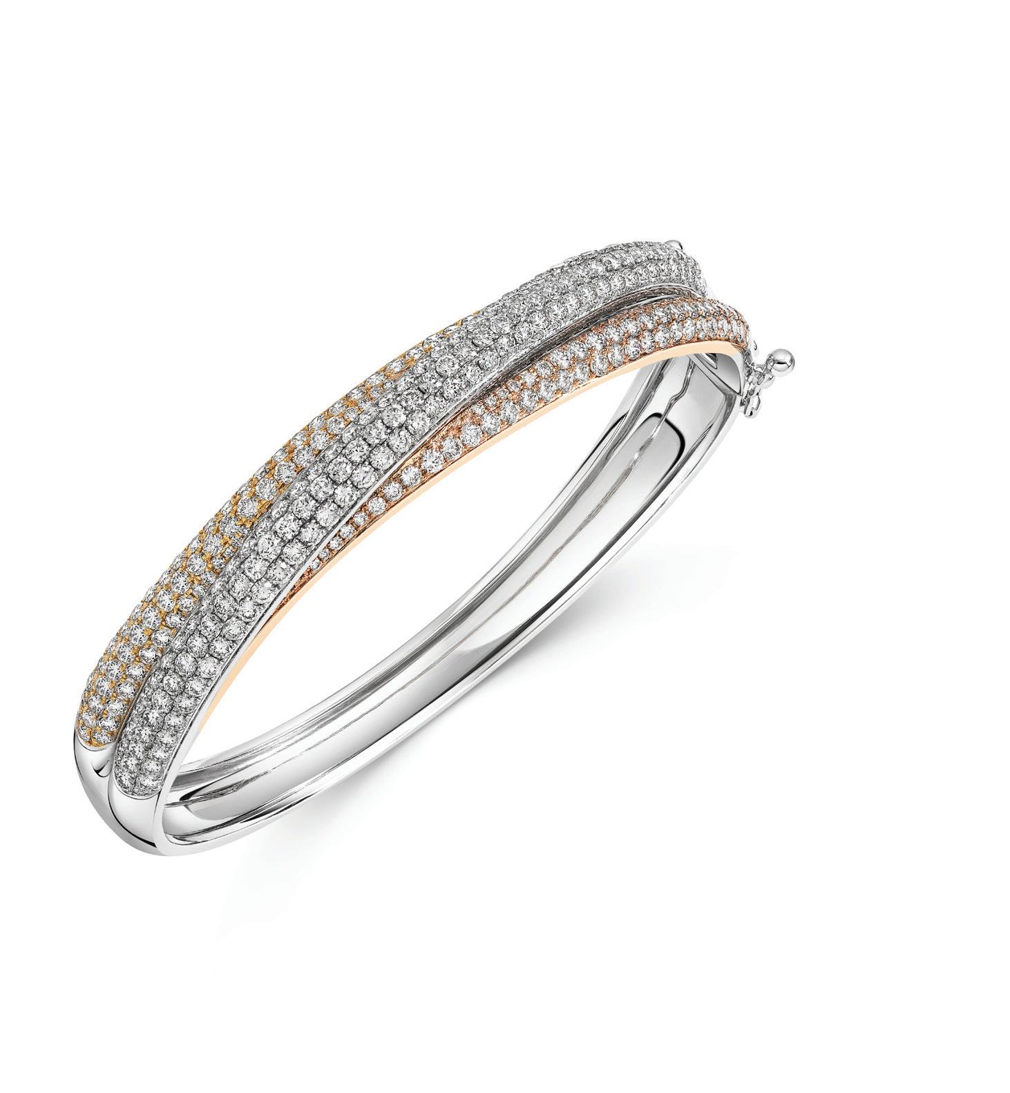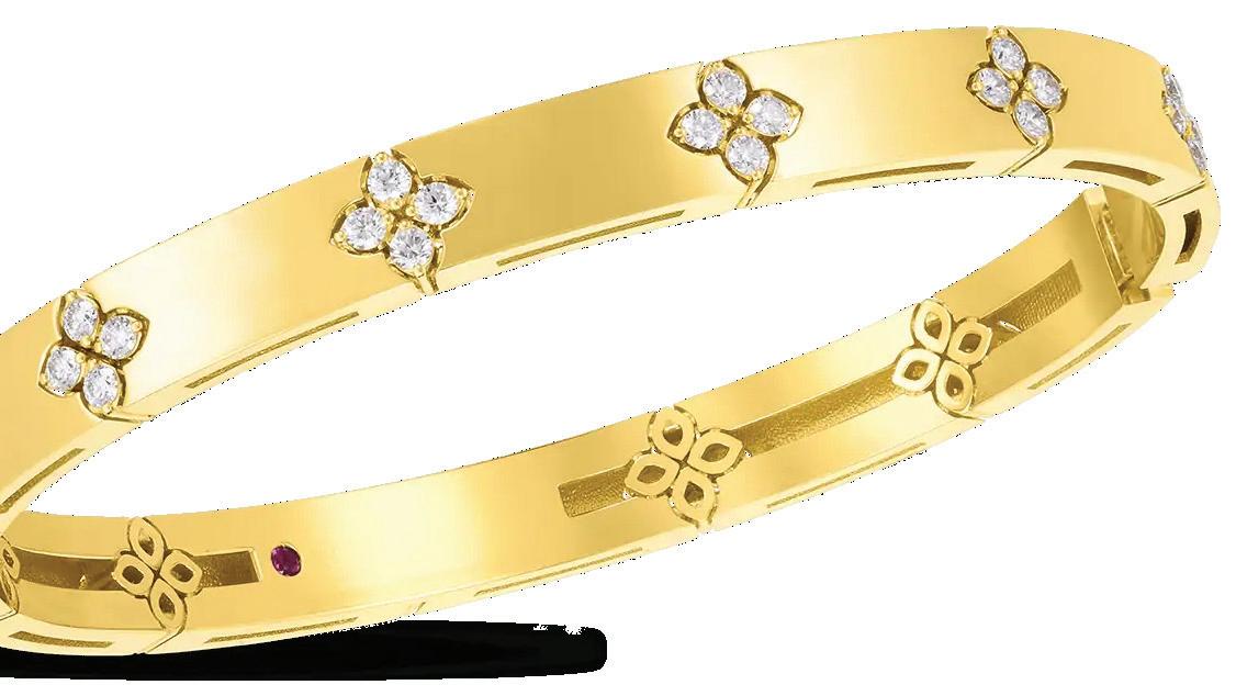 Bezel set diamond bangle bracelet in 14K yellow gold, $3,075; hinged diamond bangle bracelet in 18K yellow gold, $7,500; stretch diamond line bracelet in 18K yellow gold, $5,800; octagon mother of pearl stud set in sterling silver, $450; mixed-shape diamond ring in 14K yellow gold, $5,500; Harry Kotlar artisan diamond bangle bracelet in 18K yellow gold, $6,410; hinged diamond bangle bracelet in 18K rose gold, $2,720.