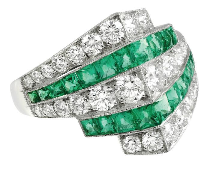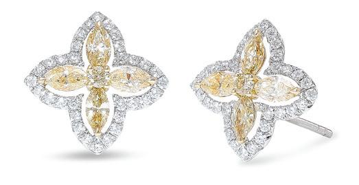 A. Fancy yellow diamond stud earrings, $4,950. B. Sapphire and diamond bracelet, $42,000. C. Emerald and diamond halo drop earrings, $10,500.