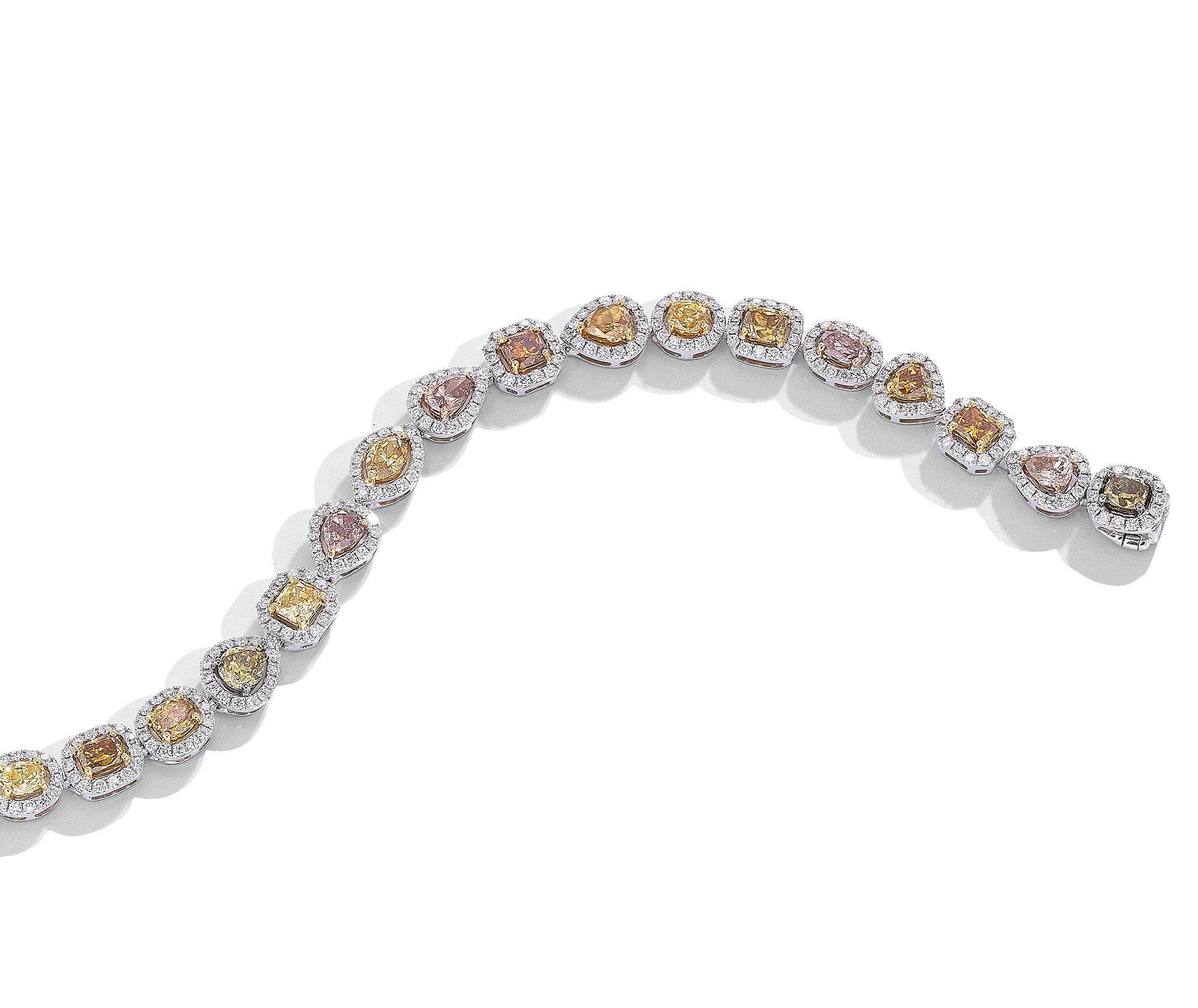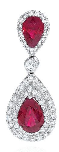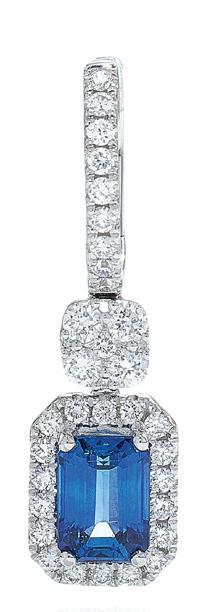 Emerald and diamond half-hoop earrings, $4,450. E. Sapphire and diamond halo drop earrings, $9,500. F. Mixed shaped fancy color diamond bracelet, $59,500. G. Ruby and diamond drop earrings, $8,700.