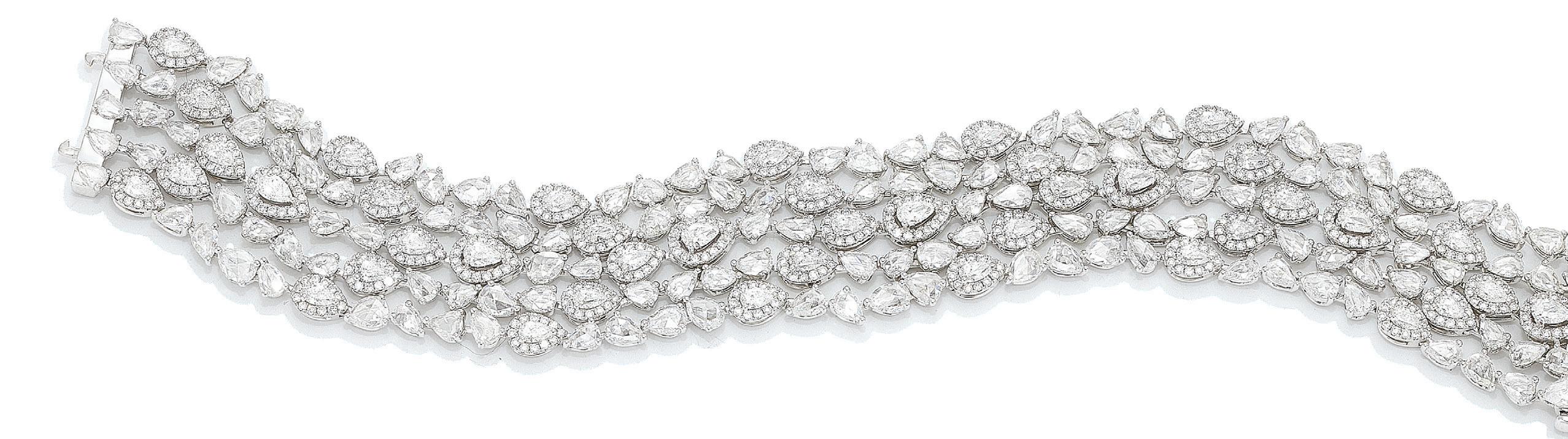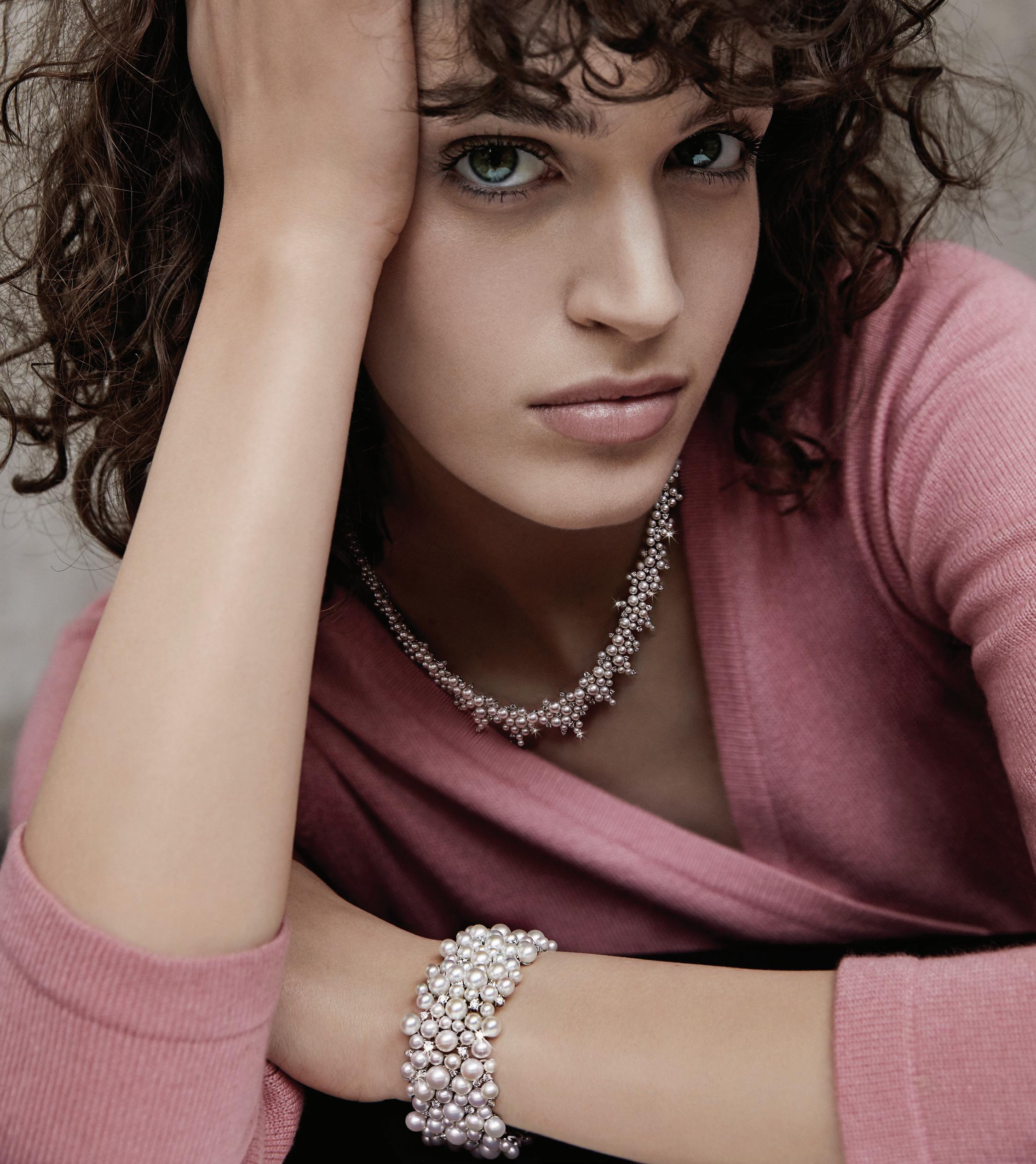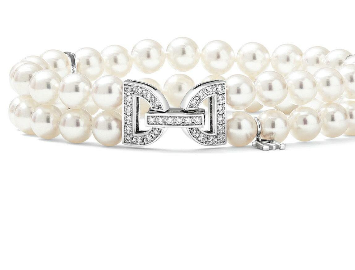14K white gold, $23,500. E. MIKIMOTO Akoya double strand pearl bracelet with diamond clasp in 18K white gold, $9,400.