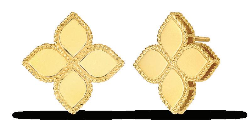 Diamond solitaire stud earrings 3.02 cts. in 18K white gold, $39,970; octagon mother of pearl stud set in sterling silver, $450; Marco Bicego Paradise five-row mixed-gemstone bracelet in 18K yellow gold, $6,680.