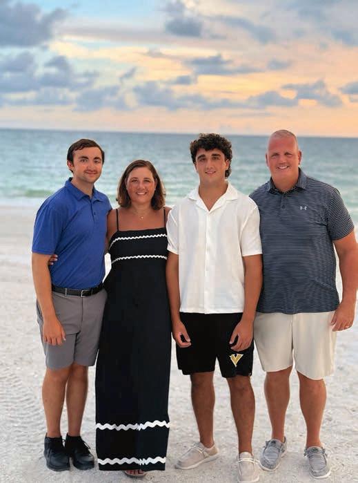 Opposite page: Celebrating Service: Kate Diskin (left) congratulates Lisa Panarelli for 25 years of service with Millburn Public Schools at Hartshorn School. This page, left: Leadership Meeting: Kate Diskin presenting to the Administrative team at the annual Summer Leadership Meeting held at MUJC. Right: The Diskin Family, from left to right: Ryan, Kate, Matthew, and Joe on a family vacation in Florida.