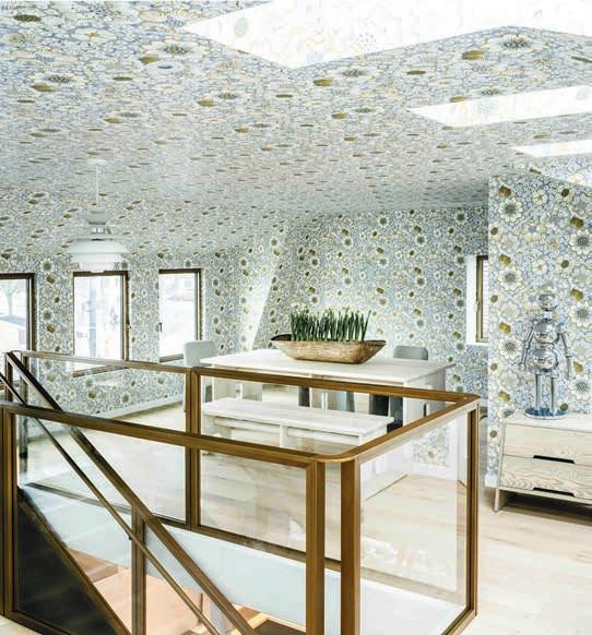 The extensively restored space features ample natural light, exposed wood beams, and a dramatic and sleek staircase, leading up to a wallpaperbedecked second floor. And, of course, furniture, décor items, framed posters and examples of Gustavian antiques.