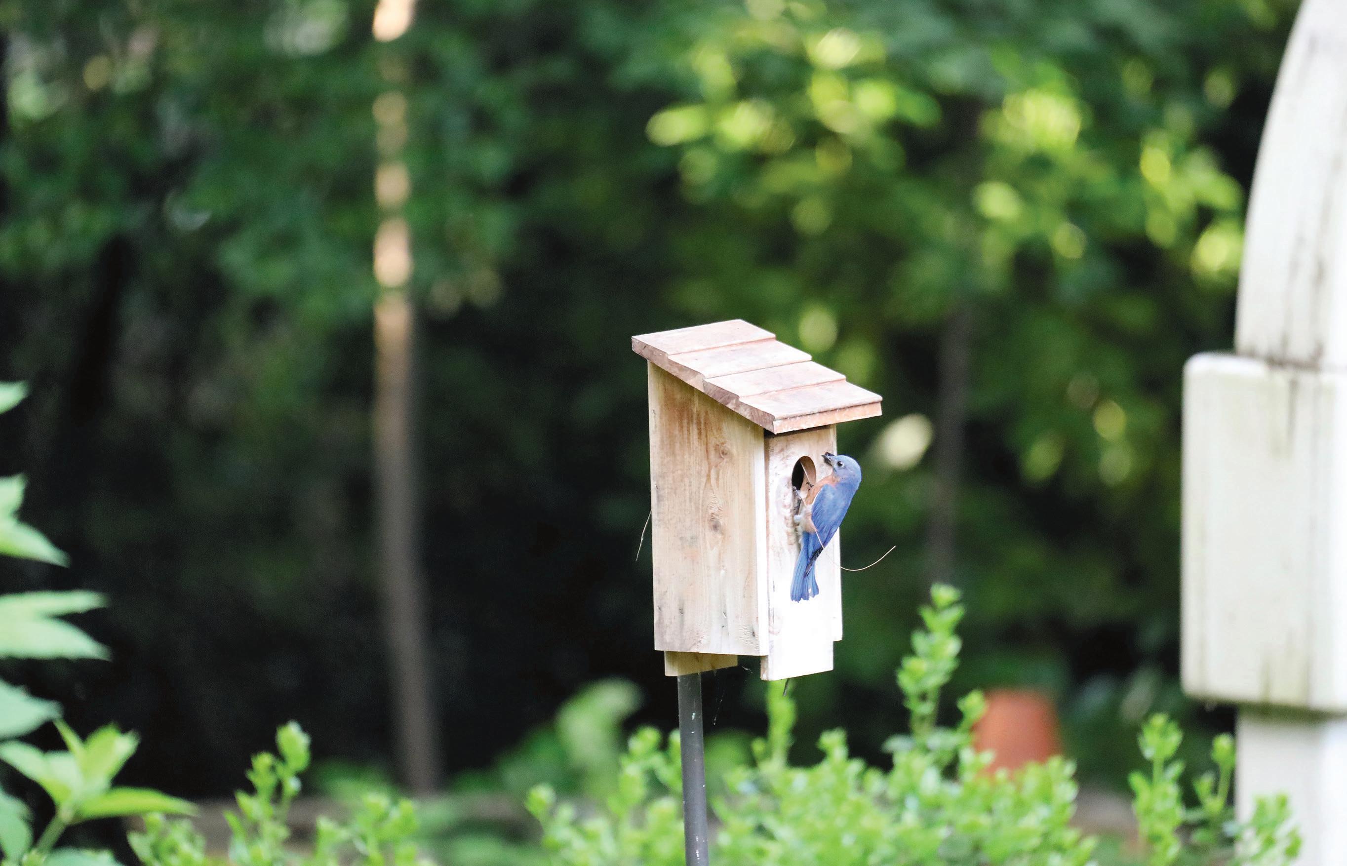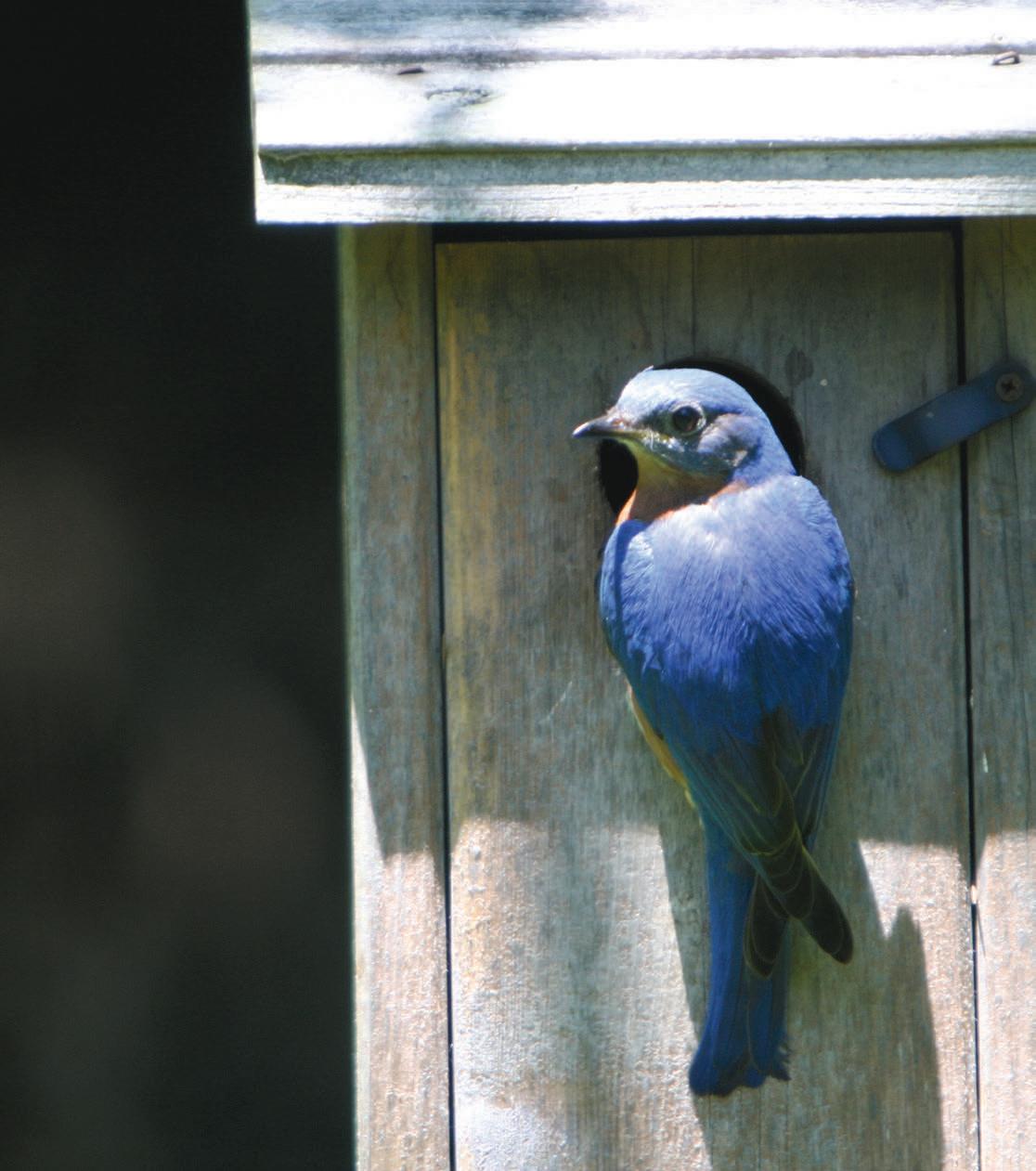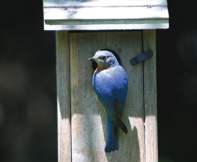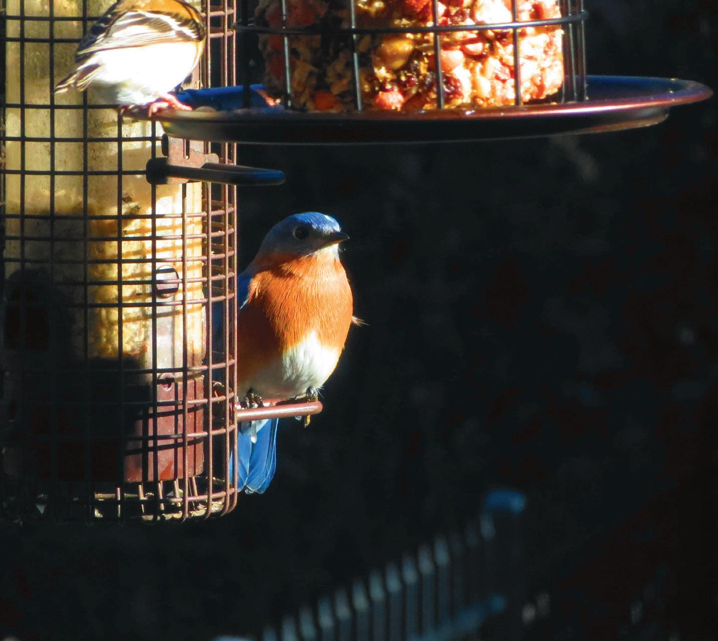 Above: A bluebird nesting box. Right: Eastern Bluebirds enjoy the feed provided here in this bird feeder.