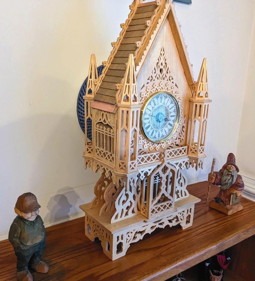 Top: Bill Moloney concentrates as he works on the head of one of his carved birds. Bottom left: One of Bill Moloney’s clocks. Bottom right: One of countless birds Bill Moloney has made.