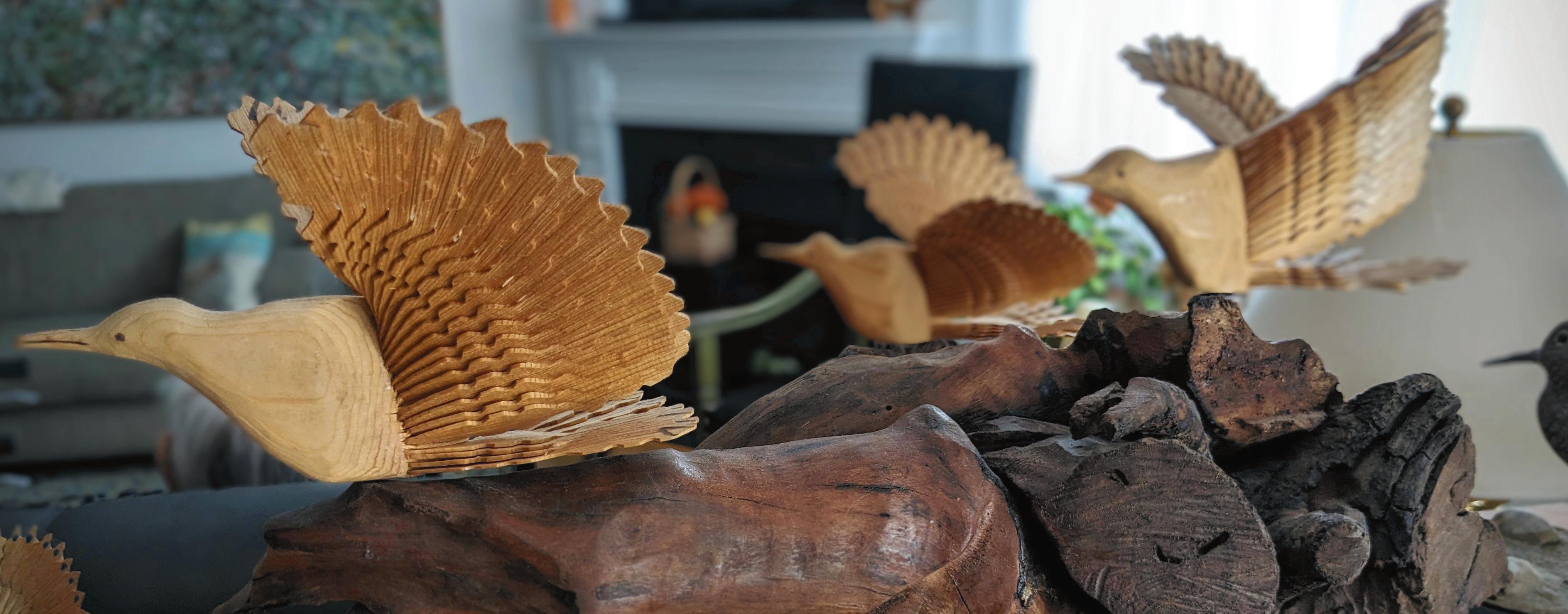 Since the 1980s, Bill has harvested wood from a friend’s land in Vermont. He explained that the Northern White Cedar found there has a strong grain, and when it’s wet you can twist it. He often carves birds that have detailed, spread feathers made as one piece, without glue. He explained the process he’s followed for decades: “I take four trees and cut them into 36-inch logs. When I get home, I put three of them in 55 gallons of water. When I need a bird, I take a log and cut it 6 inches long. I get 40 birds out of that one log,” he said. Moloney sells the birds at festivals and stores like The Mule Barn Mercantile in downtown Waxhaw.