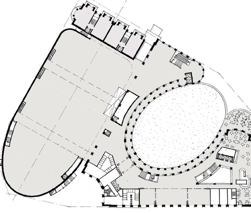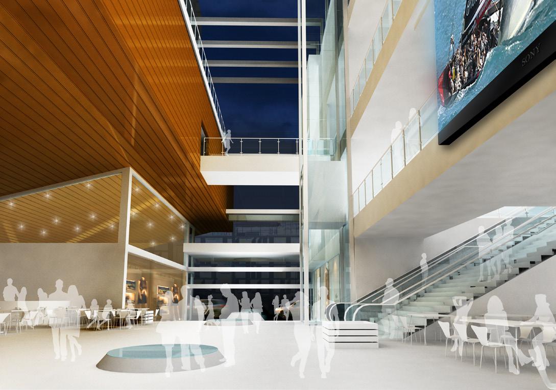 Twelve screen multiplex on the upper level exiting into a video, simulator games tenancy underneath. Externally visible links to lower levels via rock climbing gallery at one end, 22 m ferris wheel inside on north elevation, scenic lifts and banks of escalators. All of these elements are intended to express movement of people up and down the building. Kidzania replica township on mid level and retail on the ground floor. India regulations meant the international food Fourth Floor RL 127,100 October 2008 hall2ndwas located on the neighbouring site via a bridge Area Calculations connection.