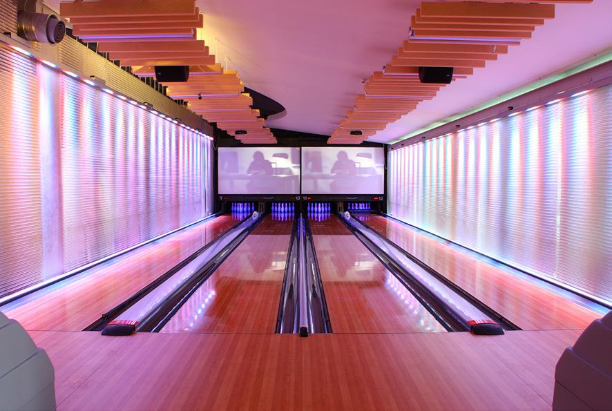 subtlety behind the ball racks, at reception, behind the bar and in the white acrylic player tables. The use of German technology absorbent material finishes over the new lanes provides texture, warmth and comfort.
