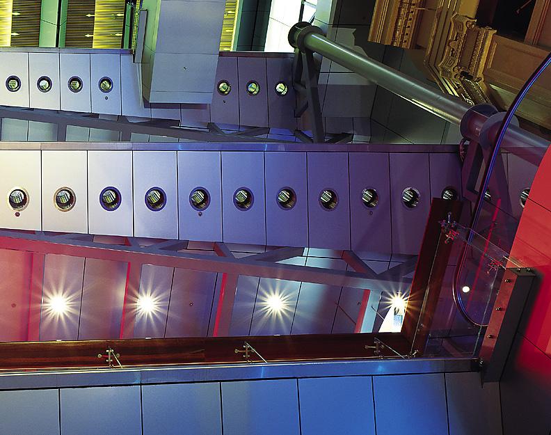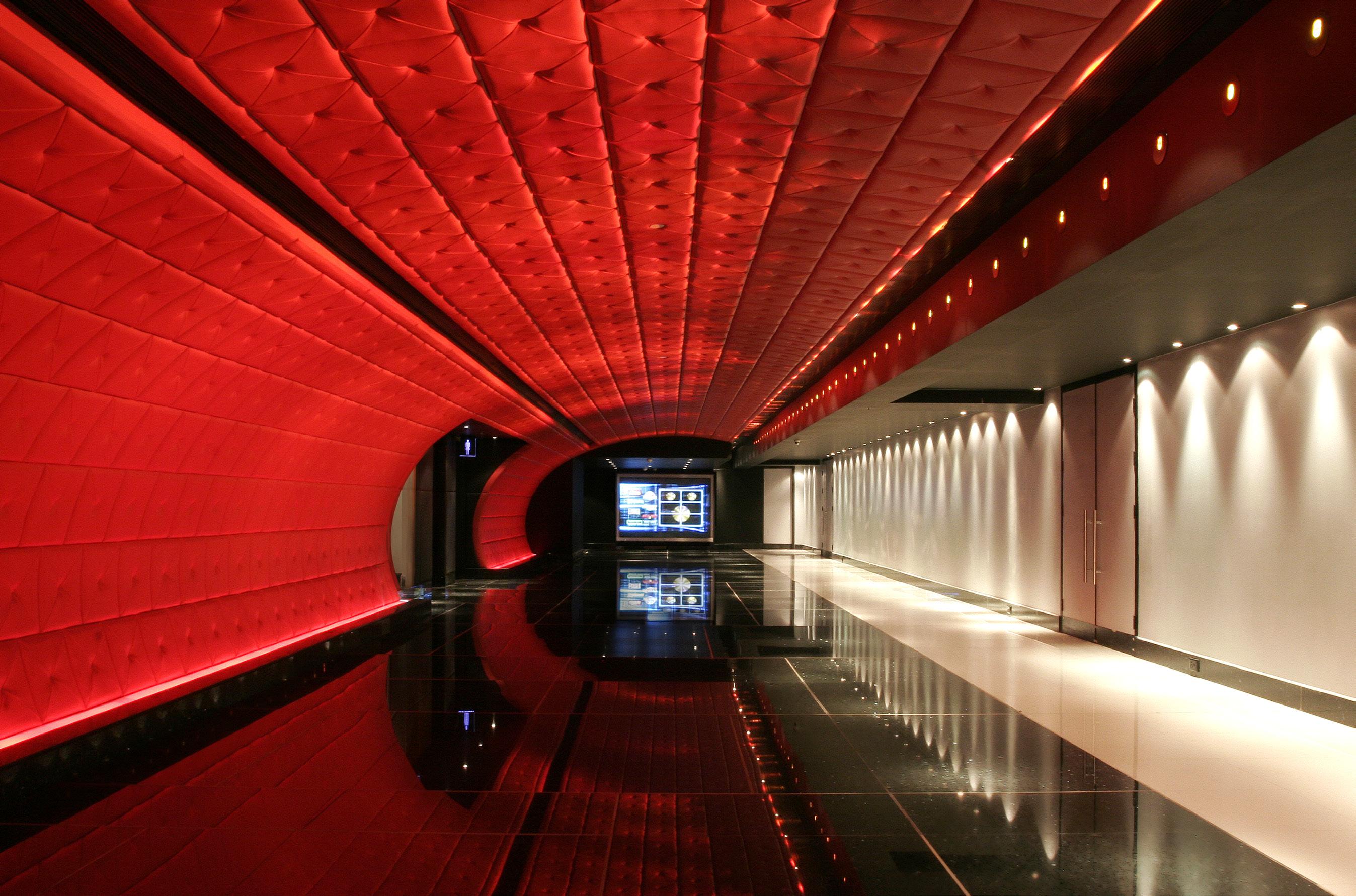 This six screen, 1100-seat complex occupies the first floor level of a multi-storey shopping centre in Bangalore, India. The concept is based around a rich colour scheme of red and blue offset against black and white ceiling and floor backgrounds. Materials were selected to define shape, changing under coloured light. Reflective and repeated shape surfaces multiply images of colour and texture. With very low ceiling heights and unworkable volumes in the shell building, this use of light and colour change give a sense of expanding space and richness of detail to the main ticket and concessions areas.