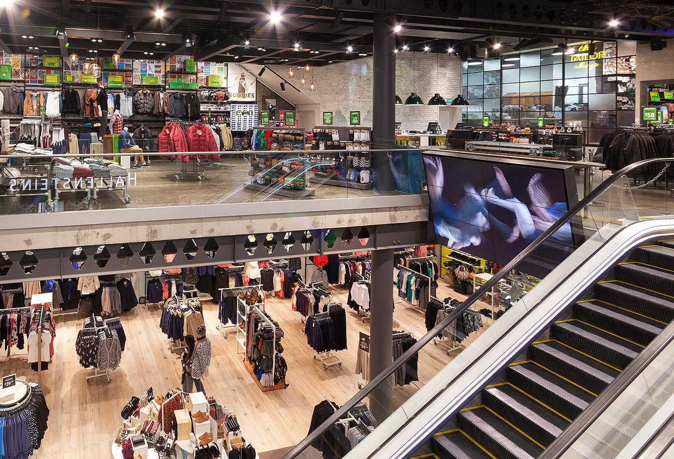 The new flagship store marks a complete departure from previous fit-outs in a number of ways: this is the first time that both brands have been housed within one space, albeit on separate levels. Is also the largest store has so far produced at around 1336 square metres. The look is pared back, minimal, industrial and edgy in keeping with the demands of its target market.