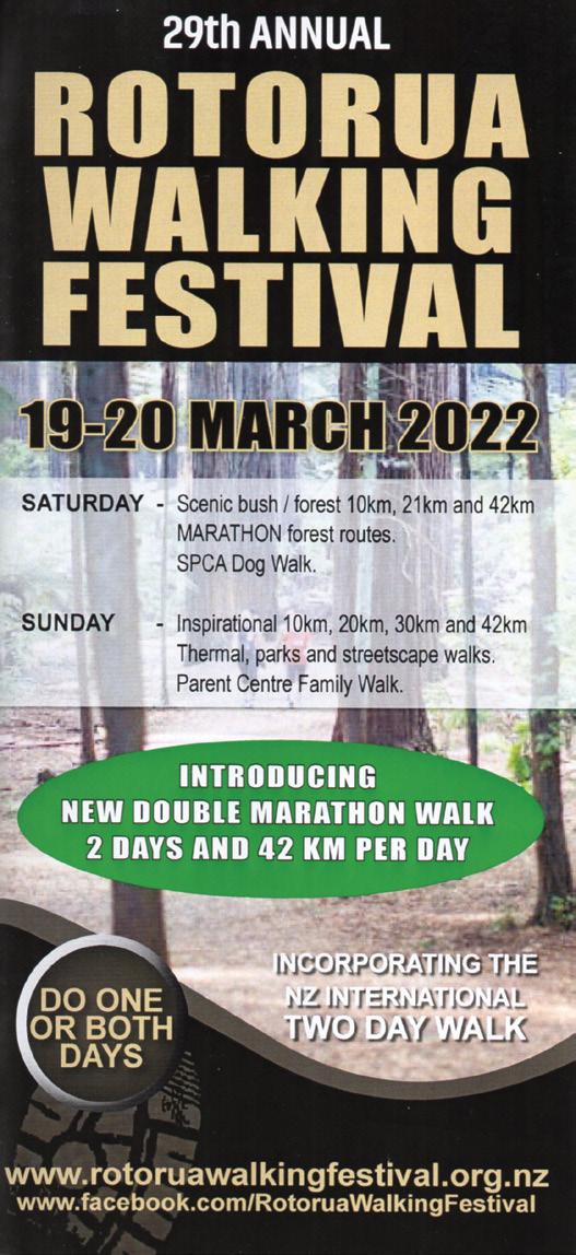 Walking New Zealand, issue no 300 - 2023 45 www.walkingnewzealand.co.nz 7 weeks starting Tuesday 17 January Join us for SUPER SEVENS 2023 Like us on Facebook facebook .com/manawatustriders & instagram @manawatustriders www.manawatustriders.org.nz RUN OR WALK your choice of 3km, 5km or 7km courses $5 Individual - $25 Series pass Family passes available Includes banana and sausage sizzle at the finish line! Series passes available online: Coming Events