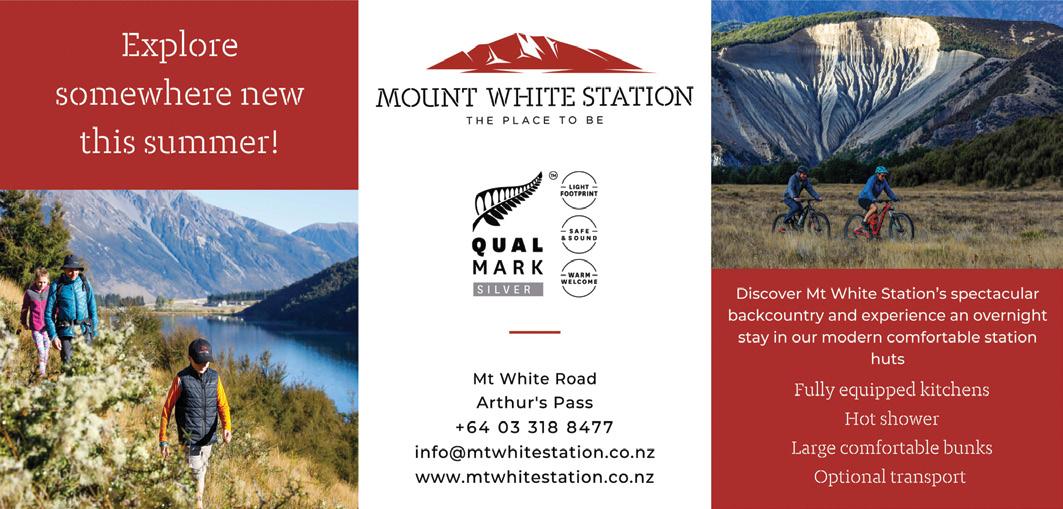 50 Walking New Zealand, issue no 300 - 2023 www.walkingnewzealand.co.nz GREAT COUNTRY BREAKS A unique four days walk or mountain bike ride in idyllic South Canterbury Phone 03-685-4848 Email: info@walkfourpeaks.co.nz 50 Walking New Zealand, issue no 300- 2023 You can now view back issues of Walking New Zealand magazine, two issues back from the latest, FREE at : http://issuu.com/walkingnewzealand. * Freedom $245 * Prime $545 * Guided $1695 Please tell our advertisers you saw it in Walking New Zealand magazine. Self guided private walking track * Choose between 3 or 2 day options. * Lodge style accommodation with fully serviced kitchens, BBQ, hot showers, comfortable bunk-beds and pillows. * Dogs welcome, kennels available at lodgings. * Pack transport each day makes for a stress free adventure. Check our availability calendar online www.islandhillsstation.com Kiwi on the Camino by Vivianne Flintoff Available from independent book sellers or directly from author E-mail : vivianneflintoffbooks@gmail.com 900kms along an ancient pilgrimage trail in Northern Spain Web: http://www.vivianneflintoffbooks.com/ Take a locator beacon with you when you are hunting, hiking or working anywhere remote and make sure you will be rescued quickly STAY SAFE IN THE OUTDOORS SPECIAL ACR ResQLink PLB - 400 Only $485 Including P&P Comes with heavy duty pouch $15 - 1 day $30 - 3 days $40 - 7 days $30 for every week after your first week of hire Available for sale or hire Locator Beacons New Zealand 03 226 6341 or 027 412 2925 www.locator beacon s.co.nz T y h re w WE-9025668AA MACKENZIE/South Canterbury NORTH CANTERBURY NORTH CANTERBURY SOUTHLAND BOOKS PORTABLE LOCATOR BEACONS PLB Boots Packs Rainwear All your tramping essentials One shop ~ Since 1988 WALKING TRAMPING GEAR