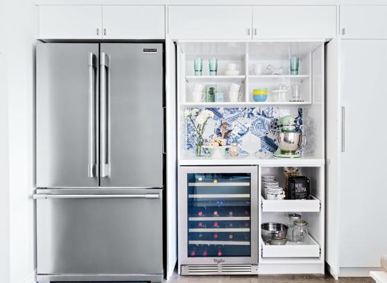 the island, the bar includes muted glass inserts in the upper cabinets and ample storage in the lowers. It’s a stylish yet functional addition, perfect for entertaining and rounding out the kitchen’s transformation.