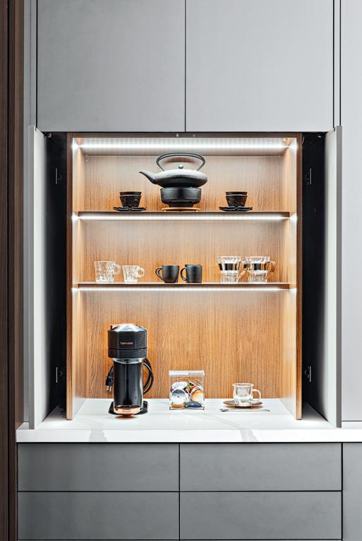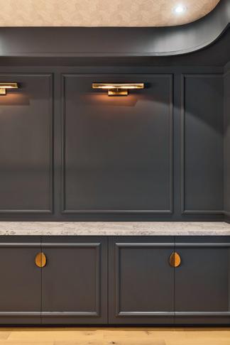 One standout feature is the custom bar area Nu-Life created a previously unused wall leading to the living room. Designed to echo the Onyx finish of