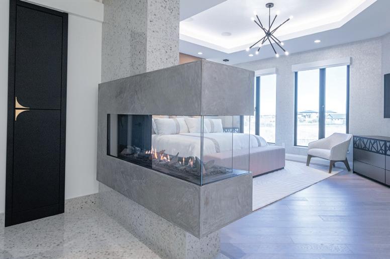 Elegant three-sided floating fireplace is a brilliant feature viewed from the bedroom & the ensuite bath. Fireplace is dressed in microcement & porcelain tile.