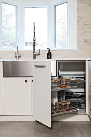 Nu-Life Kitchens’ expertise extended beyond the kitchen itself. The company installed a light valance under the upper cabinets to conceal LED lighting. The vaulted ceiling, paired with straight-style crown moulding on the upper cabinets, enhances the kitchen’s contemporary feel. To streamline the layout, the over-the-stove microwave was relocated to a full-size pantry beside the fridge, creating a sleek, built-in effect.