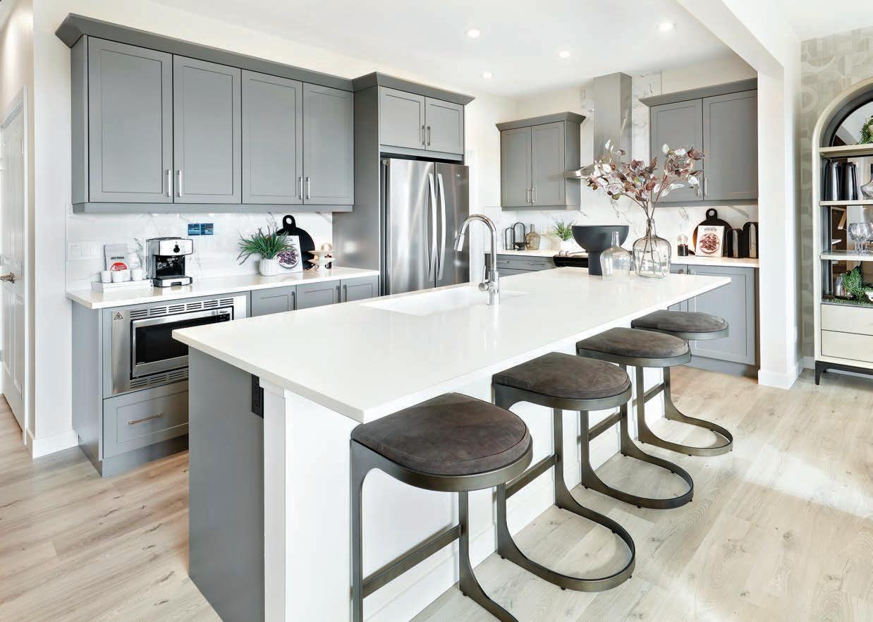 “It features many of our new popular designs such as two-toned cabinets, a large island with extra storage, black hardware and fixtures, plus black stainless appliances. A stunning design that’s functional too!” Plank says. Check out excelhomes.ca to find out more.