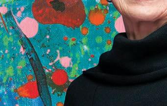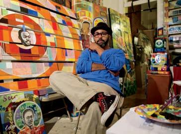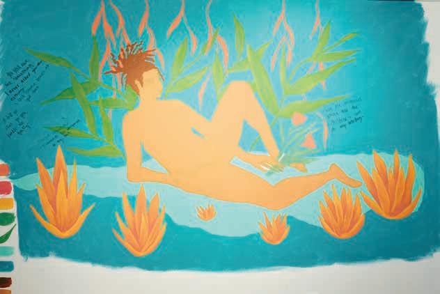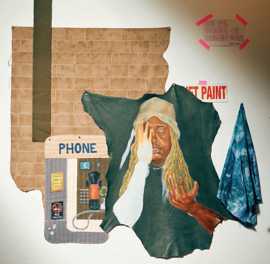 with floral appliques in various patterns, stitched together to form Black-Eyed Susans. On the quilt, she painted a portrait of a nude woman reclining on her side. The figure is rendered in shades of Haint blue, a color that is traditionally used for the underside of porch ceilings to ward off evil spirits in Southern homes. “Haint Vs. Self. Vs Justice is a collaboration quilt with my grandmother,” Bonnette says. “This piece is about a woman coming to terms with herself and her sexuality. She is surrounded in a protective veil of her ancestors — seen in the spray paint around the figure — and facing the Black-Eyed Susans, which are a symbol for justice.”