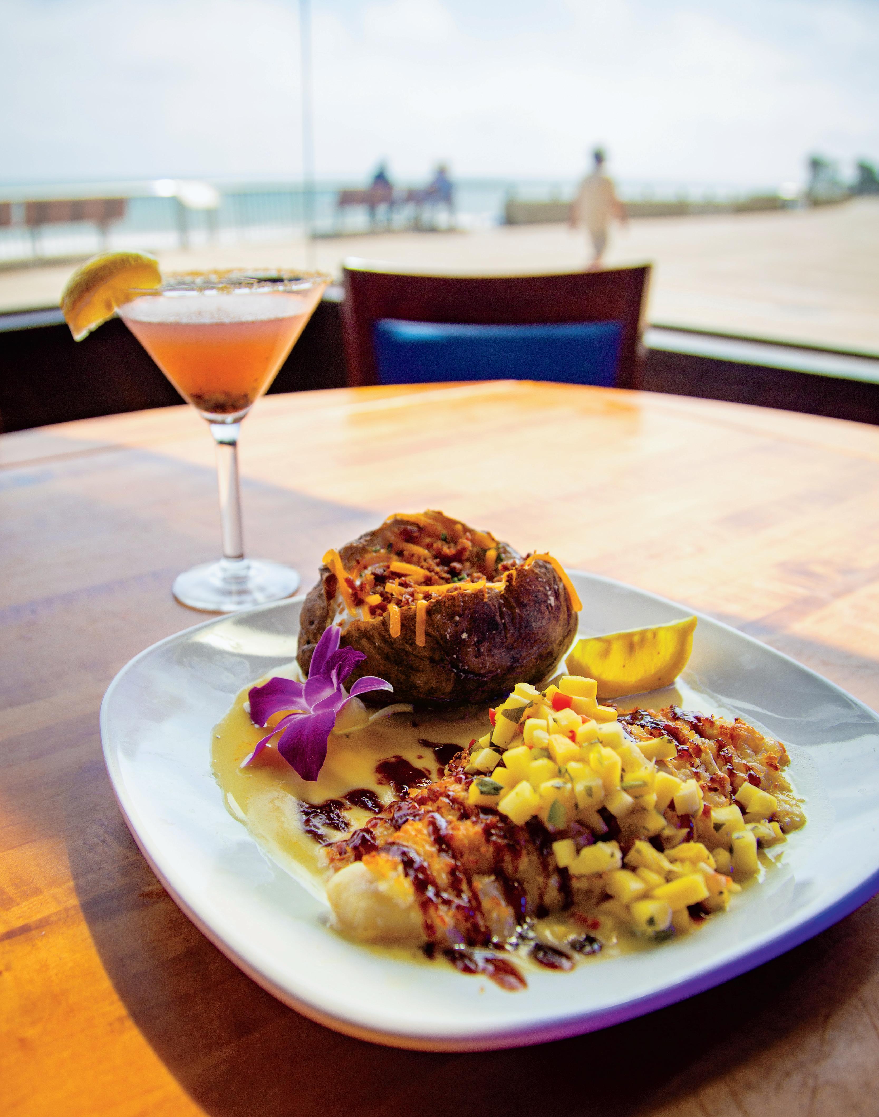 Inside, the Aloha vibes continue. Teak wooden chandeliers and local ocean artwork fill the space, and there’s no bad seat anywhere — you can see the ocean from the entire restaurant. Every item on the menu is made from scratch, down to the hand-cut steaks and sea food. Try the seared ahi with ginger-soy butter or make a big impression with the table-side seared filet.