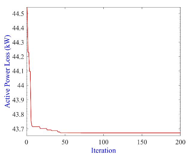Case 1: in this case, a single objective function of minimizing active power loss (Ploss) is considered.