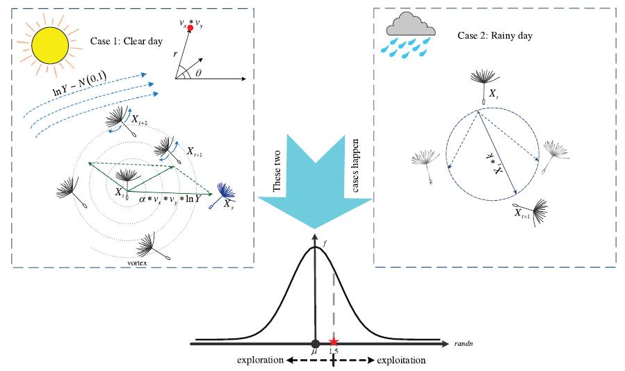 Where randn() is the randomnumber that follows the standard normal distribution. Figure 1 shows the behaviour of dandelion seeds flying under different weather conditions. The approximate regeneration locations of dandelion seeds are given in the figure. First, when the weather is clear, dandelion seeds are updated based on randomly selected location information to emphasize the exploration process. The eddy above the seed acts on the moving vector by multiplying the �� and �� components to correct the direction of the dandelion’s movement in a spiral. In the second case, dandelion seeds are exploited in all directions in the local community. The normal distribution of random numbers is used to dynamically control exploitation and exploration. To make the algorithm more global search-oriented, the cut-off point is set to 1.5. This setting makes dandelion seeds traverse the entire search space as much as possible in the first stage to provide the correct direction for the next stage of iterative optimization.