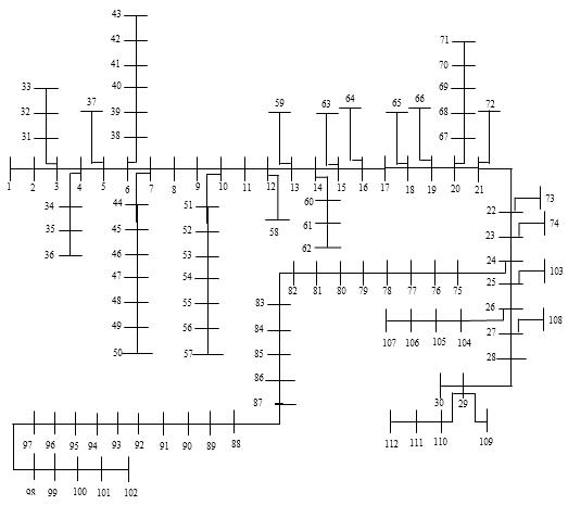 The Algerian 112-bus radial distribution system, shown in Figure 9, has a total active load of 3.36 MW and, a total reactive load of 3.72 MVAr. The rest of the system data is available in [25].