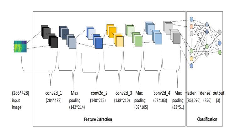 As the CNN model is a kind of Deep Learning system which can take an input picture, attach importance to the image in the form of customizable weights and biases, and differentiate between various characteristics or objects included within the Log Mel Spectrogram images. ConvNets need a far less amount of preprocessing than do other classification methods due to the nature of their architecture The development of a ConvNet, which is comparable to the functionas a strategyofNeurons inthe human brain, was inspired by the layout of the Visual Cortex. This makesit viableforeffectivelanguageclassification.Thedetailed description of the CNN model is demonstrated in Figure 3. Preparation of the CNN model has CNN has four convolution layers, with the first, third, and fourth layers using maximum pooling. In this case, we have 3*3 kernel size for convolution layers and 2*2 kernel size for pooling layers