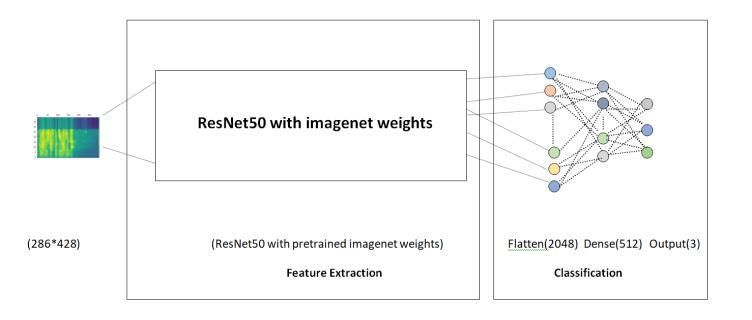 Resnet50 is a deep convolutional neural network with 50 layers. Here we use a pre trained Resnet50 model with an ImageNet weight but in classification layer we use dense layer with size 512.