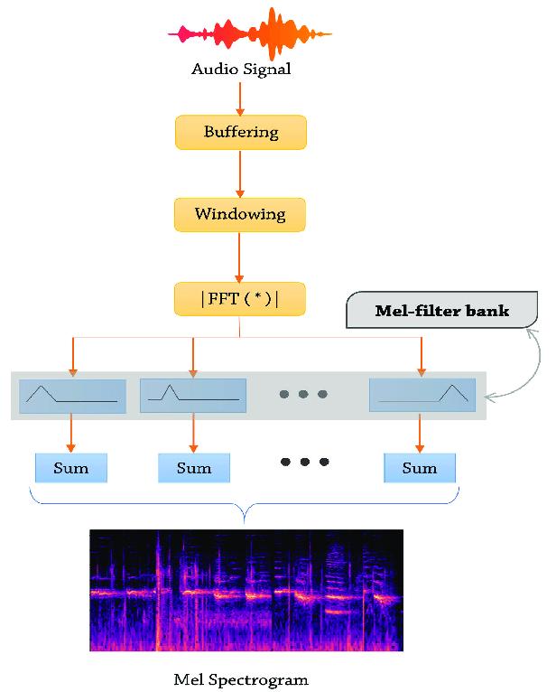It is the second phase in our process, and its major goal is to generate a frequency spectrum employing various steps with no information losing. The Figure 2, shows detailed activities starting from data preprocessing, buffering, windowing, Fast Fourier Transformation, filtering, Mel scaling [18] and further followed by log( ) Mel Spectrogram phases as the final entity