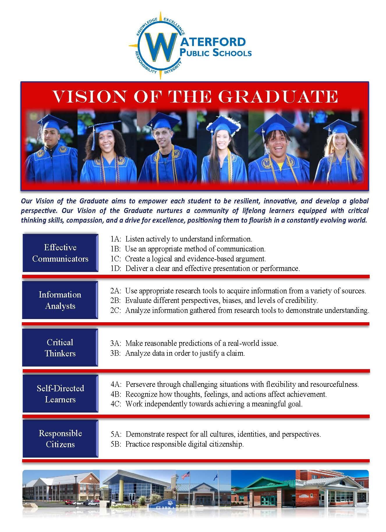 Waterford Public Schools is a community of learners that fosters and supports high aspirations, ensuring every student acquires the skills and knowledge necessary to be a responsible citizen, prepared to contribute and succeed in an ever-changing world.