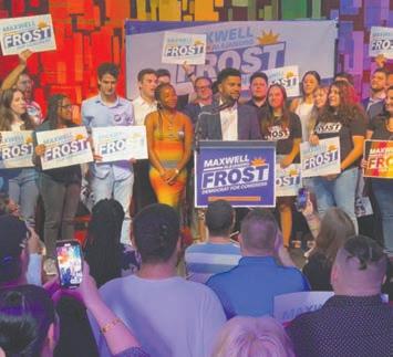 ON TO WASHINGTON: Maxwell Frost speaks to a crowd of supporters at the Renaissance Theatre in Orlando after winning the democratic nomination for U.S. representative in Florida’s District Aug. 23. SCREENSHOT VIA BRANDON WOLF’S FACEBOOK