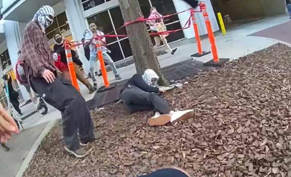 J Brown was seen in the video huddling over Moukaddam after the altercation. As a member of the CFL Queers For Palestine, their job was to serve as a first aid and assist those who may become hurt or injured while out protesting. Brown was arrested along with Moukaddam and was placed in a jail bus shortly after the incident occurred.