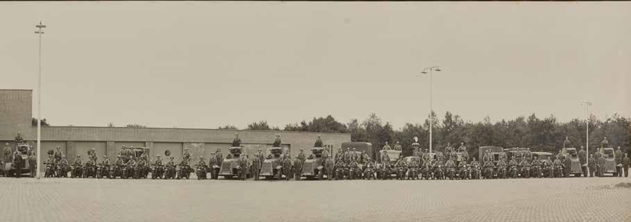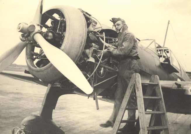 ↑ Een panoramafoto van de eerste volledig gemotoriseerde gevechtseenheid van de landmacht: het 1e eskadron Pantserwagens. Alles en iedereen van deze eenheid staat in 1938 aangetreden en opgesteld voor het Pantserwagengebouw op de Vughterheide. In het midden de Commandogroep, met de Landsverk M.38 van de commandant en zes ordonnansen op Harley Davidsonmotoren. Aan beide zijden van de commandant staan de Harleys van de geneeskundige groep (twee stuks) en de administratieve groep (twee, waarvan een met zijspan). Links en rechts van de commandogroep staan de drie pelotons met elk drie Landsverk pantserwagens M.36 (een ontbreekt er ter rechterzijde) en een mitrailleurgroep op elf Harley Davidson-motorfietsen, waarvan er twee bewapend zijn met een 7,9mm-mitrailleur. Verder nog twee motordonnansen, eveneens op Harley Davidsons. Bij het rechterpeloton staan ook nog de motorfietsen van de ondersteunende groepen (vijf stuks). In de tweede lijn staan onder meer zes Fordson-vrachtauto’s van de ondersteunende groepen (vier voor munitie en twee voor brandstof). Verder een herstellingsauto, een proviandauto en twee vrachtauto’s. Helemaal linksachter staat een keukenaanhangwagen met Ford-trekker. ↓ Een Nederlandse vliegtuigmaker pleegt onderhoud aan de negencylinder Bristol Mercury-stermotor van een Fokker D.21. Vanaf 1938 komen er 36 van deze jachtvliegtuigen in Nederlandse dienst. De toestellen zijn behoorlijk wendbaar, maar door het niet intrekbare landingsgestel en de minder krachtige motor is de D.21 een stuk langzamer dan de Messerschmitt Bf 109, het standaardjachtvliegtuig van de Luftwaffe. Ook beschikt het Nederlandse toestel over minder zware bewapening.