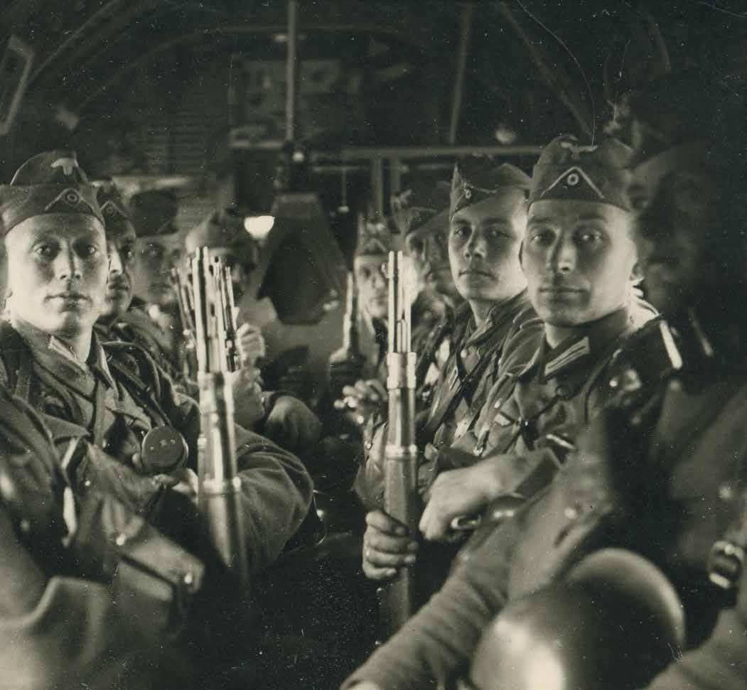 Voor: Duitse Luftlandetruppen in een Junkers ju 52 op weg naar Nederland, mei 1940.