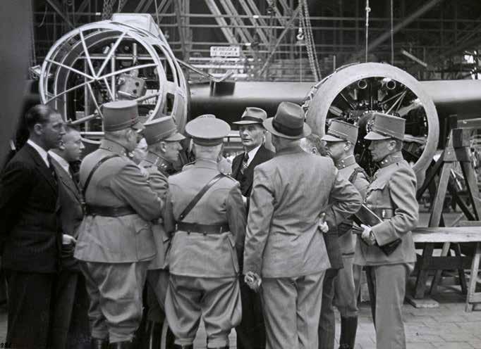 ↑ Op 16 augustus 1939, slechts enkele weken voor de afkondiging van de algemene mobilisatie, bezoekt minister Adriaan Dijxhoorn de Fokkerfabrieken in Amsterdam-Noord. Hij is nog geen week eerder aangetreden als minister van Defensie. Dijxhoorn is verantwoordelijk voor de vervanging, begin 1940, van generaal Izaäk Reijnders als opperbevelhebber door generaal Henri Winkelman. ↓ Een blik in de fabricagehal van de Fokkerfabriek aan de Papaverweg in Amsterdam-Noord. De productielijnen van de Fokker D.21 (rechts) en de Fokker G.1 (links) staan dicht op elkaar.