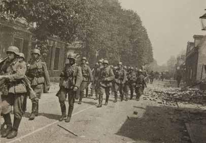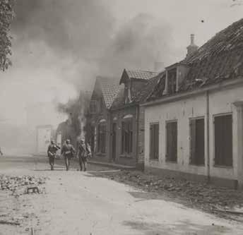 Achter: De strijd voorbij. Nederlandse militairen geven zich over aan hun Duitse tegenstanders.