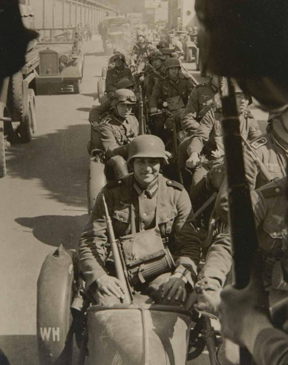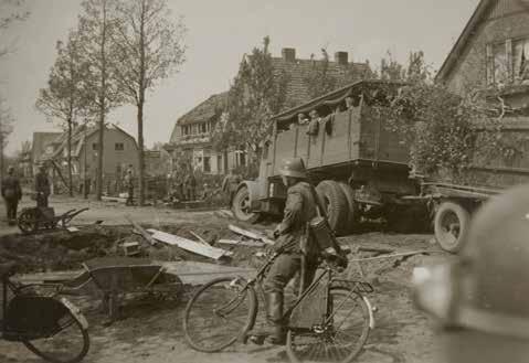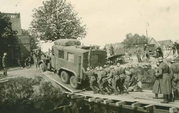 ↑ Een Heinkel He 111, mogelijk van het Kampfgeschwader 54, vliegt op lage hoogte over een kanaal in Noord-Nederland. De Luftwaffe speelt een belangrijke rol bij de ondersteuning van de grondtroepen tijdens de mei-oorlog. ← Duitse geniesoldaten bouwen in recordtempo provisorische bruggen over kanalen en rivieren. De Wehrmacht beschikt hiervoor over verschillende typen noodbruggen. Welke oeververbinding wordt aangelegd is afhankelijk van de breedte van de watergang en de gewenste draaglast. Op de foto is zojuist ergens in Noord-Nederland een pontonbrug ‘Gerät-A’ gereedgekomen. Deze kan een last van 7 ton dragen en 75 meter overspannen. Over de brug rijdt een 10,5cm leichte Feldhaubitze 16/22 getrokken door een zestal paarden. → Duitse militairen slepen in een van de noordelijke provincies met de hand een 10,5cm leichte Feldhaubitze 16/22 over een geïmproviseerde pontonbrug gedragen door rubberboten. ↘ Met hun tweewielers steken Duitse militairen op 10 mei 1940 in het noorden van het land een brede sloot over. Hoewel op de foto staat geschreven dat hij is gemaakt in het plaatsje Vries in Noord-Drenthe, bestaat er ook een vergelijkbaar exemplaar in een fotoalbum waarbij staat dat de opname bij Achlum in Friesland is ‘geschoten’.