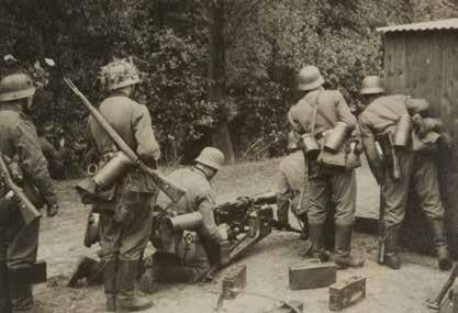 Op de weg Scherpenzeel-Woudenberg vallen onder infanteristen en pioniers slachtoffers door in het wegdek verstopte mijnen. ↘ Duitse militairen brengen een Maxim MG 08 in gereedheid. De mitrailleur stamt uit de Eerste Wereldoorlog. Tijdens de Tweede Wereldoorlog doet het wapen nog steeds dienst bij de Duitse infanterie, vooral bij tweedelijnseenheden. Ook het Nederlandse leger heeft dit type machinegeweer in gebruik, onder de naam M25. Tijdens de meidagen presteert dit machinegeweer zeer matig.