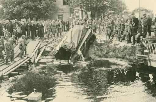 ↖ ‘Tja, hoe gaan we dit aanpakken?’ Terwijl op de achtergrond drie Krupp L3H163-radiowagens geparkeerd staan die zonder problemen over de provisorische brug bij Zwartemeer zijn gekomen, is het met het overduwen van een aanhangwagen – Stahlfeldwagen (Hf.7) – misgegaan. De trailer is deels in het water beland. Enkele tientallen Duitse militairen kijken wat beteuterd toe. Ook de nodige Zwartemeerders zijn op het tumult afgekomen. ↗ In de middag van 10 mei bereiken militairen van het 22e Reiter-Regiment de stad Meppel. Veel gevochten wordt er niet. Alleen bij het buurtschap Oosterboer vinden wat schermutselingen plaats. Daarbij sneuvelt sergeant Andries Swart van 2-II-33 RI. Nog dezelfde dag wordt de opmars voortgezet in de richting van Lemmer. → De spoorbrug over de Smildevaart in het baanvak Steenwijk-Meppel ligt in de F-lijn en wordt door Nederlandse militairen vernield. ↓ Zwartemeer, 10 mei 1940. Een Krupp L3H163-radiowagen wordt met vereende krachten over een provisorische brug ter hoogte van café Kamerling over het Van Echtenskanaal geduwd. In de eerste oorlogsuren worden de bruggen over deze waterweg door Nederlandse militairen vernield. De hoop is dat de Duitse opmars daarmee wordt vertraagd.