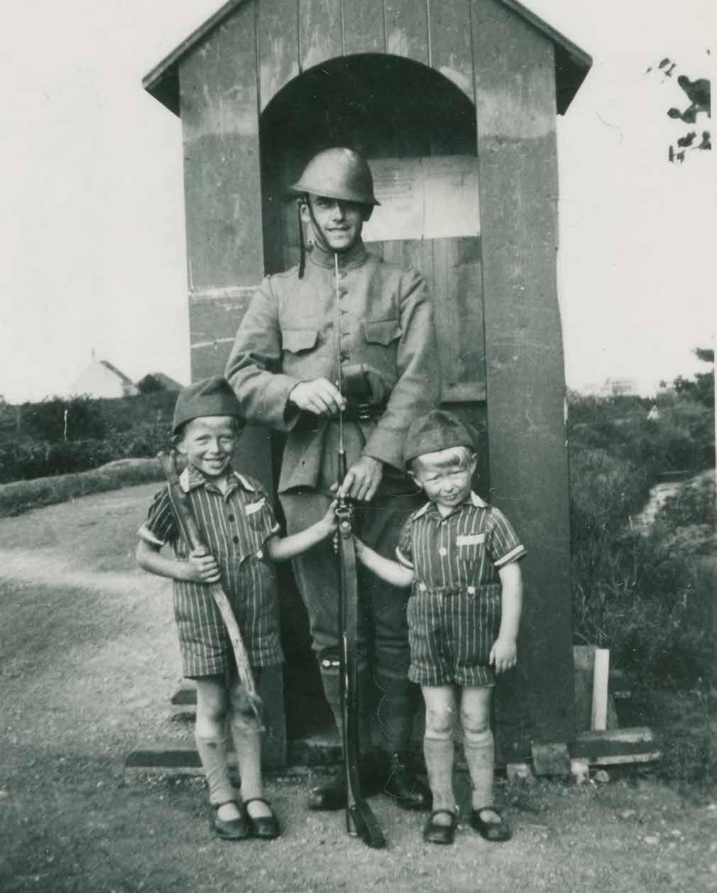 Aangenaam gezelschap voor deze soldaat tijdens de wachtdienst. Hij staat op wacht met een M95-karabijn voorzien van een bajonet en op zijn hoofd heeft hij een M16-helm. De twee identiek geklede kinderen dragen voor het fotomoment een militaire veldmuts.