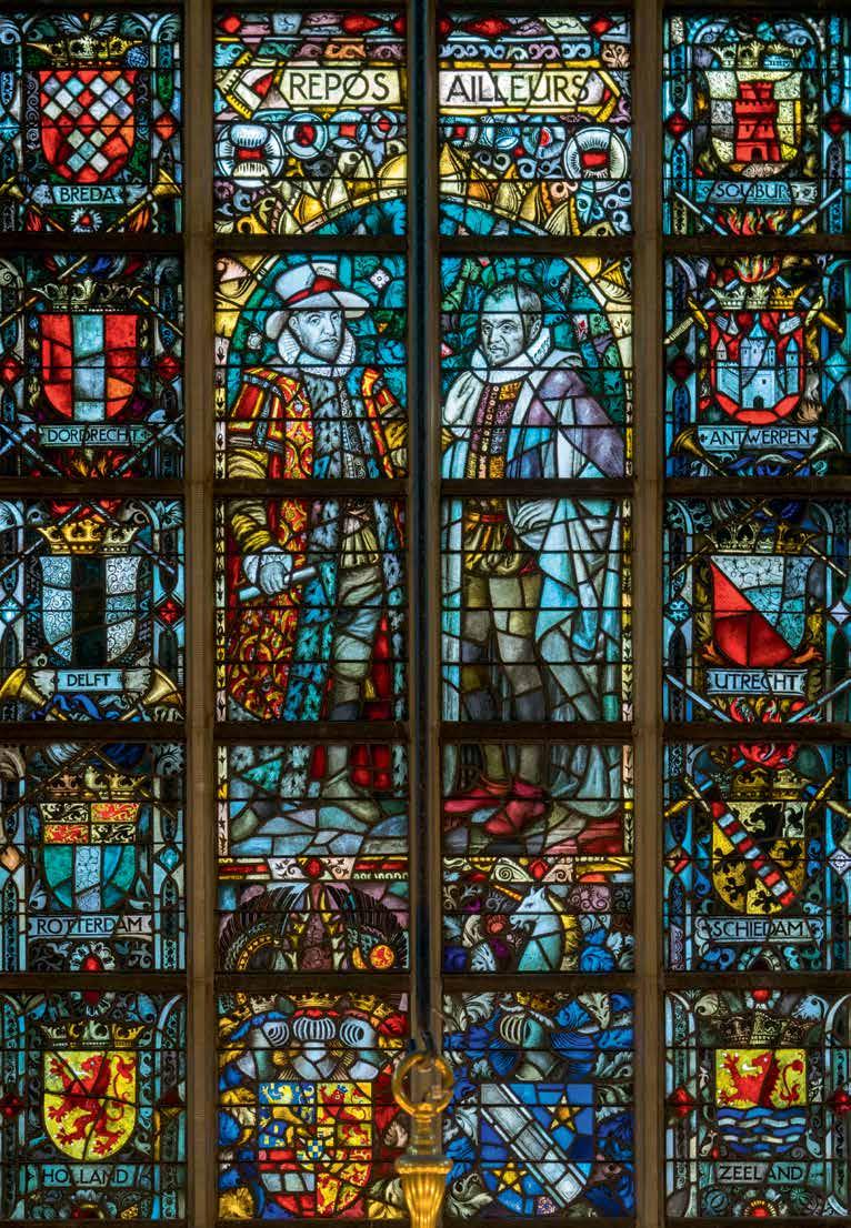 Vooraanzicht en detail (rechter pagina) van het Marnixvenster in het oostelijke glas-in-loodraam van de kooromgang, Stichting Pieterskerk Leiden. Fotografie Hielco Kuipers