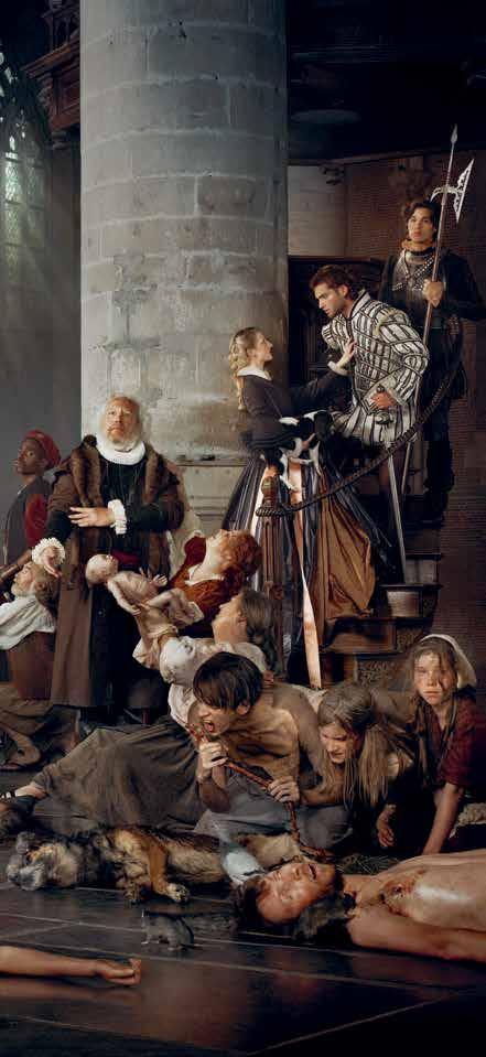Speelse innovatie of imitatie leenden zich ook voor het zoeken naar een verbinding met oude tradities of een suggestie van continuïteit. Twee voorbeelden kunnen dit illustreren. In de Kerkmeesterskamer van de Pieterskerk, waar de kerkvoogdij eeuwenlang vergaderde, bevindt zich in een rijkgedecoreerde wandkast een zogenaamde ‘buffetnis’ waarin de leden van de kerkvoogdij hun wijnglazen voor bij de maaltijden bewaarden. De glazen verdwenen echter spoorloos in de periode van het vertrek van de hervormde gemeente en de vroege fase van het stichtingsbeheer. Daarom werd het gebruik opgevat om afscheidnemende bestuursleden van de stichting een glas aan te bieden waarin hun naam gegraveerd stond en deze in de buffetnis te plaatsen, zodat de oorspronkelijke toestand na verloop van tijd door imitatie gerecreëerd zou worden.84 Het andere voorbeeld is het afscheid van Goekoop als voorzitter van de SPL, dat in 1998 samenviel met de voltooiing van een jarenlange restauratie van het Van Hagerbeerorgel. Goekoop had een belangrijke bijdrage geleverd aan de fondsenwerving voor het project; de totale kosten bedroegen ƒ5,5 miljoen. Als afscheidsgeschenk werd daarom het familiewapen van Goekoop op het orgel toegevoegd, tussen de familiewapens die de toenmalige kerkmeesters in 1808 hadden laten plaatsen (zie H1).85 De twee voorbeelden hebben een aantal overeenkomsten: het zoeken van aansluiting bij oudere tradities vertegenwoordigde ten eerste zowel het creëren – of uitbeelden – van een continuïteitsbeleving, ten tweede een poging om de tradities relevant of ‘levend’ te houden en tot slot een speelse manier om het verleden benaderen. Het recreëren van het verleden stond ook centraal in een project van de fotograaf Erwin Olaf (1959-2023), die in 2011 op uitnodiging van Museum De Lakenhal en de Universiteit Leiden een fotoreeks produceerde over het thema Leids Ontzet. Voor het project werden historische taferelen in de Pieterskerk geënsceneerd. Het hoofdwerk was geïnspireerd op het schilderij De gebedsdienst na het Ontzet van Leiden door Jan Hendrik van de Laar uit 1861. Een dramatische compositie uit drie delen werd met modellen en figuranten in historische kostuums tot een geheel gesmeed. Een curator van de Bijzondere Collecties van de Universiteitsbibliotheek oordeelde dat Olaf “een nieuw genre [heeft] uitgevonden, dat van de ‘historische fotografie’.”86 In de foto’s verwerkte Olaf op subtiele wijze een aantal moderne details, zoals een iPod, een moderne halsketting en een model op teenslippers.87 Op een speelse manier recreëerde Olaf zo een werk uit de historische overlevering, verwijzend naar de verhalen over het Leids Ontzet en ensceneerde dit in de Pieterskerk, dat tegelijkertijd fungeerde als historisch