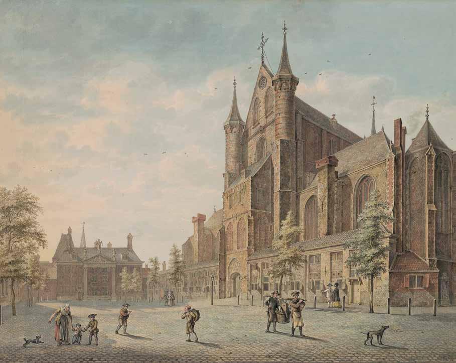 De Pieterskerk werd tot in de tweede helft van de negentiende eeuw nog omringd door proveniershuisjes. Aan de noord-, zuid- en westzijde van het monument stonden deze huisjes toen ook nog, waarvan een impressie is te zien op de prent van H.P. Schouten (1747-1822) uit 1782. Tegenwoordig resteren alleen de huizen aan de oostzijde op het Pieterskerkhof. Zoals in het hoofdstuk ter sprake komt hadden de huisjes ook een gemeenschappelijk karakter: de bewoners zorgden voor het schoonhouden van de straten rondom de Pieterskerk. Op de prent van Schouten uit 1782 is helemaal rechts, tegen de buitengevel van de doopkapel, ook een waterpomp te zien. Het lijkt een klein detail, maar het illustreert het gemeenschappelijke gebruik van de Pieterskerk – en vergelijkbare stadskerken – als publiek bouwwerk. Het ontwerp en de decoraties op de pomp geven het een statig voorkomen, passend bij zowel de toegang tot water als publieke voorziening in die tijd, als het monumentale karakter van het gebouw.