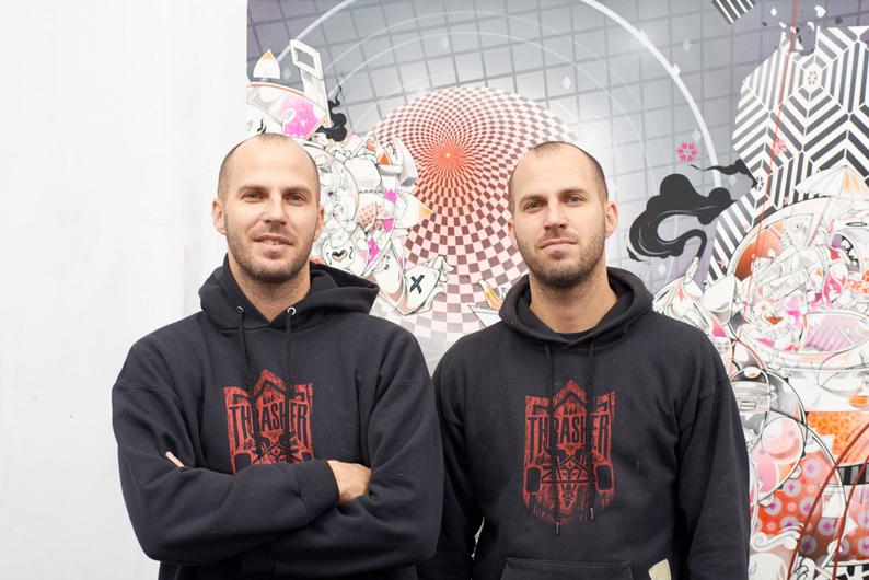 Known as How & Nosm, identical twin brothers Raoul and Davide Perre create large-scale spray-painted murals that adorn walls in cities across the world, as well as prints and paintings on canvas. Executed in their signature palette of reds, whites, and blacks, the artists’ complex, meticulously detailed designs are populated by geometric patterns and stylized characters engaged in dubious activities Their work frequently references personal history, including their experiences living under Franco’s dictatorship in Spain, and themes of duality that investigate their genetic bond and collaborative endeavors.