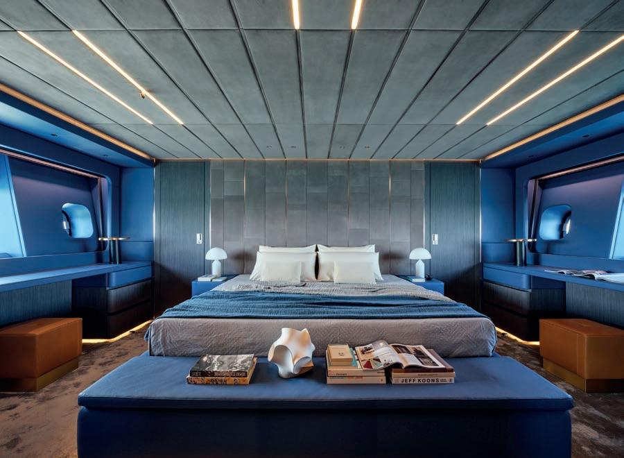 THE MASTER CABIN STANDS OUT FOR ITS MORE INTENSE TONES AND SLIGHTLY HIGHER CEILING. A DISTINCTIVE FEATURE IS THE BACKLIT HEADBOARD, DESIGNED AS A DECORATIVE SCREEN THAT DISCREETLY SEPARATES THE SLEEPING AREA FROM THE WARDROBE, ENSURING ABSOLUTE PRIVACY AND COMFORT IN A SOPHISTICATED SETTING.
