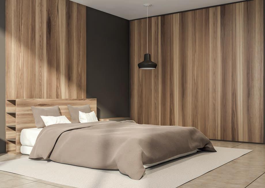 cannettatura lignea che prosegue in verticale, creando un'illusione di continuità e profondità. Inserti in pellicola effetto acciaio aggiungono un tocco contemporaneo, mentre l'alternanza di parquet e moquette sui pavimenti conferisce un'eleganza senza tempo. Nei bagni, il materiale ceramico effetto marmo coniuga bellezza e praticità. La cabina armatoriale si distingue per i toni più intensi e un soffitto leggermente più alto. Un elemento distintivo è la testiera retroilluminata, concepita come un paravento decorativo che separa in modo discreto la zona notte da quella armadio, garantendo un'intimità e un comfort assoluti in un ambiente dal design ricercato.