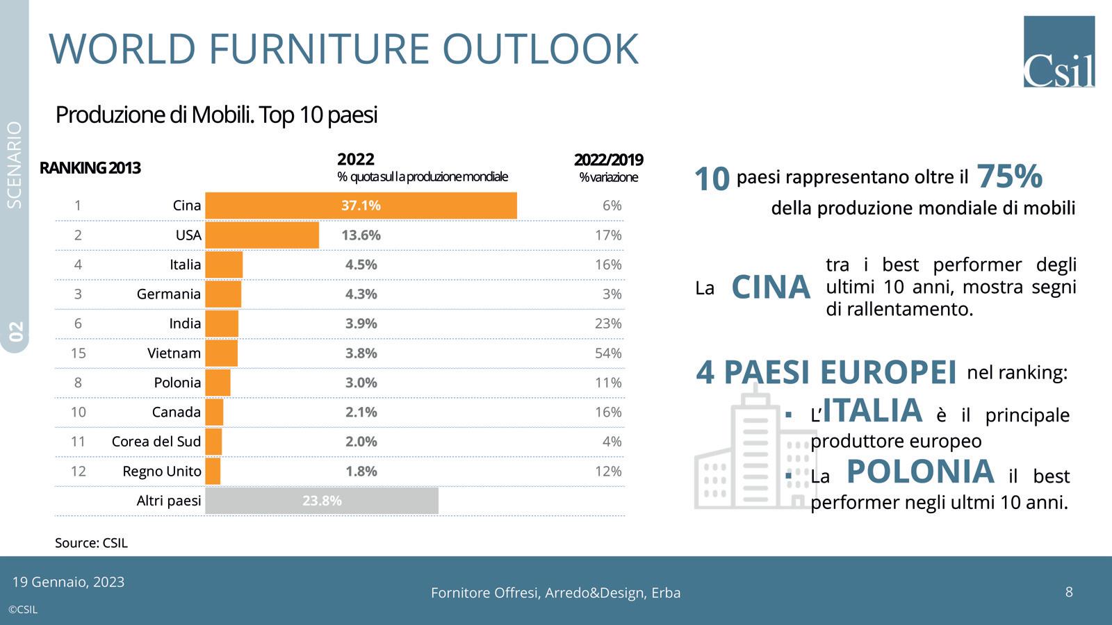 STEFANO GHINASSI, ESPERTO IN MATERIA DI TRASFORMAZIONI FORESTALI E DI FLUSSI INTERNAZIONALI DEI PRODOTTI FORESTALI LAUREATO IN “SCIENZE E TECNOLOGIE DEL LEGNO” E ABILITATO ALL’ESERCIZIO DELLA LIBERA PROFESSIONE DI PERITO INDUSTRIALE LAUREATO , CI RESTITUISCE LA SUA FOTOGRAFIA PUNTUALE SULL’ANDAMENTO DEL MERCATO INTERNAZIONALE NELLA SECONDA PARTE DEL 2022, SOTTOLINEANDO CHE IL MERCATO ITALIANO HA MANTENUTO UN LIVELLO DI CONSUMI BUONO DURANTE TUTTO L’ANNO 2022 CONTRARIAMENTE AD ALTRI PAESI EUROPEI, ANCHE SE IL 2023 È INIZIATO CON UNA FORTE INCERTEZZA ECONOMICA…