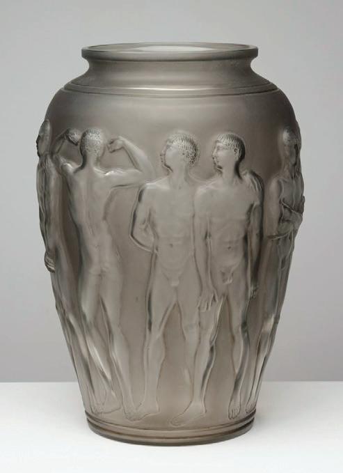 The competition for each piece made for an exhilarating auction, with prices for the fine glass escalating to new records. The piece Perruches (Parakeets) for instance, exceeded $50,000, having only held the high estimate of $12,000. Fever pitch was reached with the sale of Palestre (Palaestra), a grey-glass mould blown piece, displaying intricate acid-etched figures standing in classical poses. The vase blitzed the high estimate of $35,000 to reach $71,700 including BP.