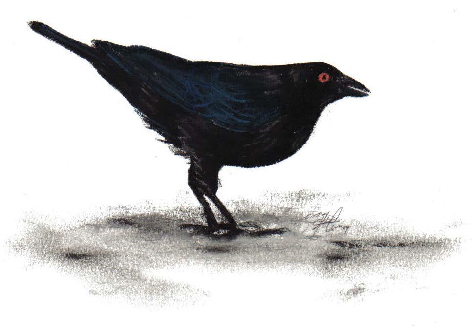 Esta ave presenta un plumaje tornasolado que emite destellos en gamas de azul y negro. Su característica principal es la intensa coloración roja que posee en la pupila. Suele viajar en grandes grupos, alimentándose principalmente de los sembradíos de los campos de cultivo.