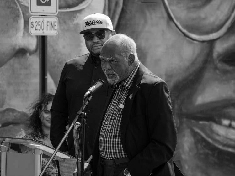 As Morris Reed of the Westside Health Authority listens, Cong. Danny Davis speaks at celebration of new e Bloom of Resilience mural.